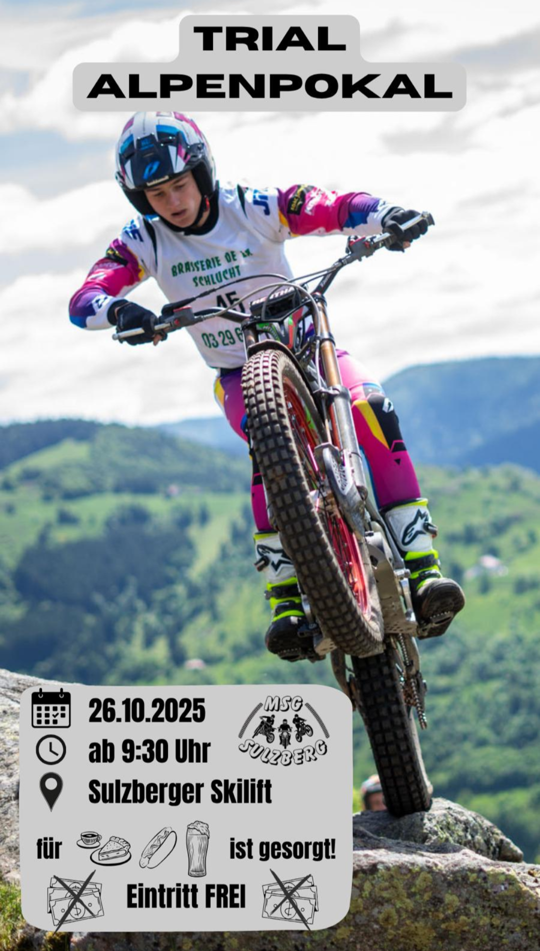 Mit insgesamt 17 Meisterschaftsläufen war der Trial Alpenpokal 2025 erneut eine beeindruckende Saison des Motorrad-Trialsports in Südbayern und darüber hinaus. Der Startschuss fiel im April mit den Veranstaltungen beim 1.MTC München und MC Peißenberg, gefolgt von den Läufen beim TC Muckham und MSC Röhrenbach im Mai. Im Juni gastierte die Meisterschaft beim TC Sibratsgfäll in Vorarlberg (Österreich).